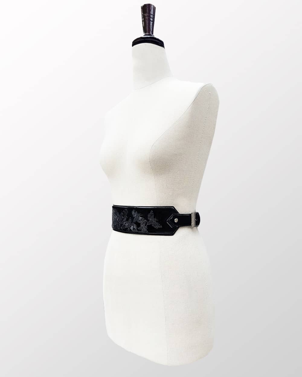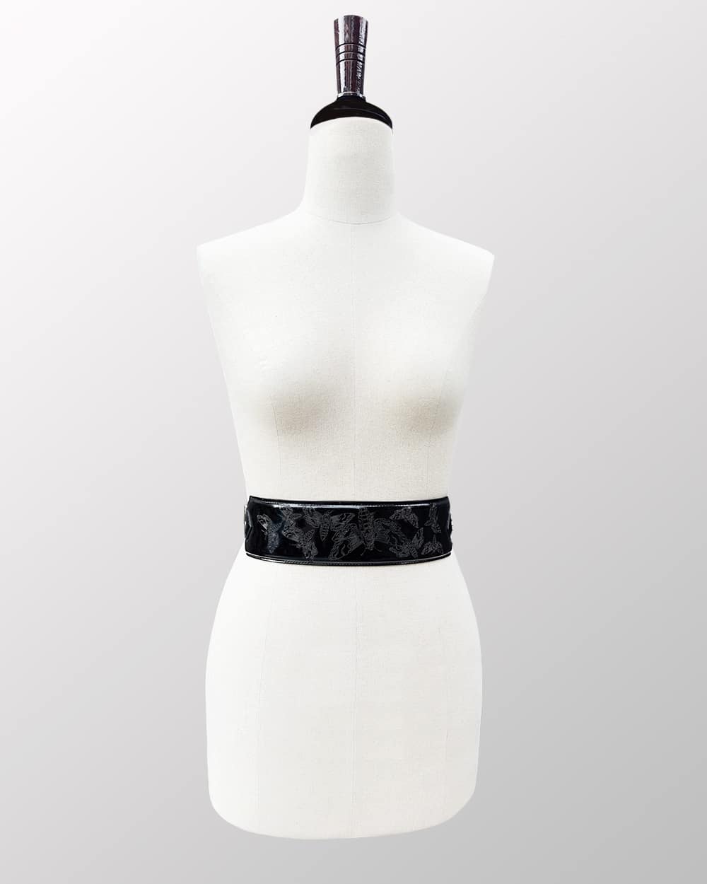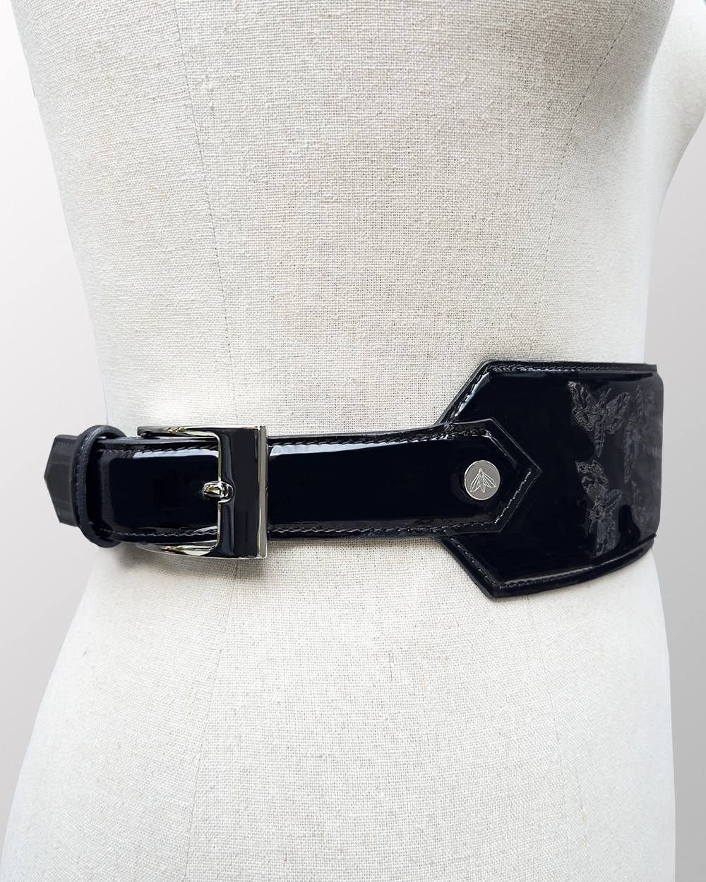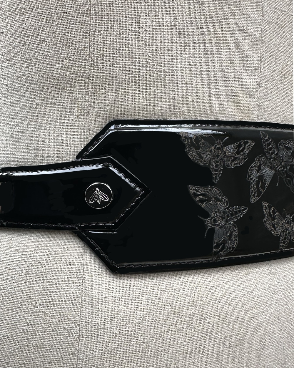 Sur le devant de la ceinture, les ailes du papillon Sphinx, emblème de DEA Cult, sont finement gravées dans le cuir verni. Ce motif profond, inspiré de l’univers du tatouage, s’inscrit avec précision dans la matière.