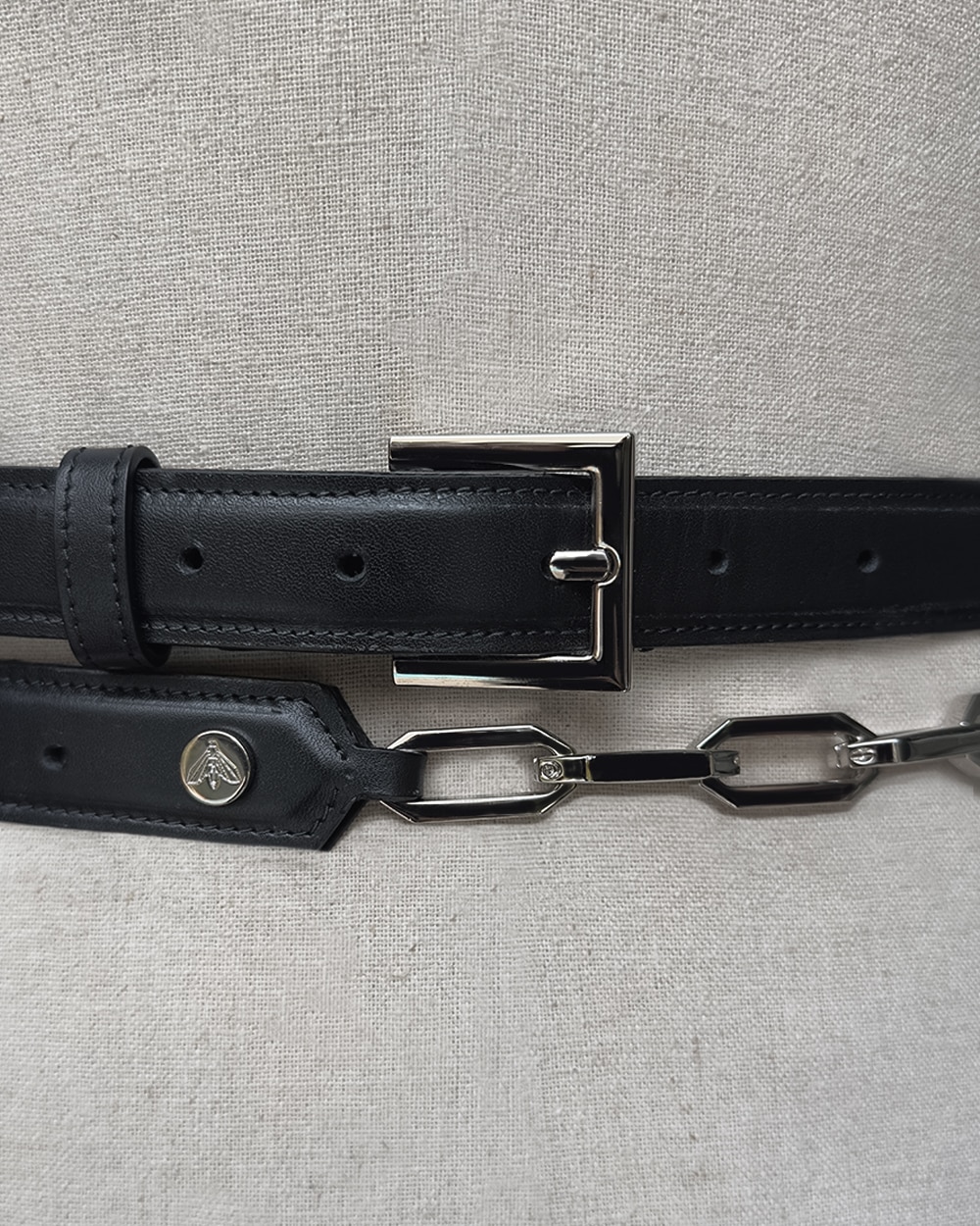 Les deux ceintures sont finies par une boucle en nickel argent brillant, au design contemporain et épuré, apporte une touche métallique maîtrisée.