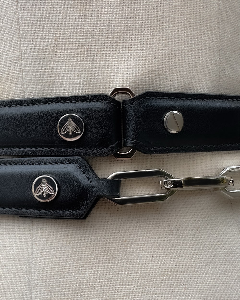 Pensée pour être portée en double, la ceinture Karl associe la ceinture en cuir Kyle à une seconde ceinture chaîne, qui vient ceinturer la taille dans un jeu de superposition.
