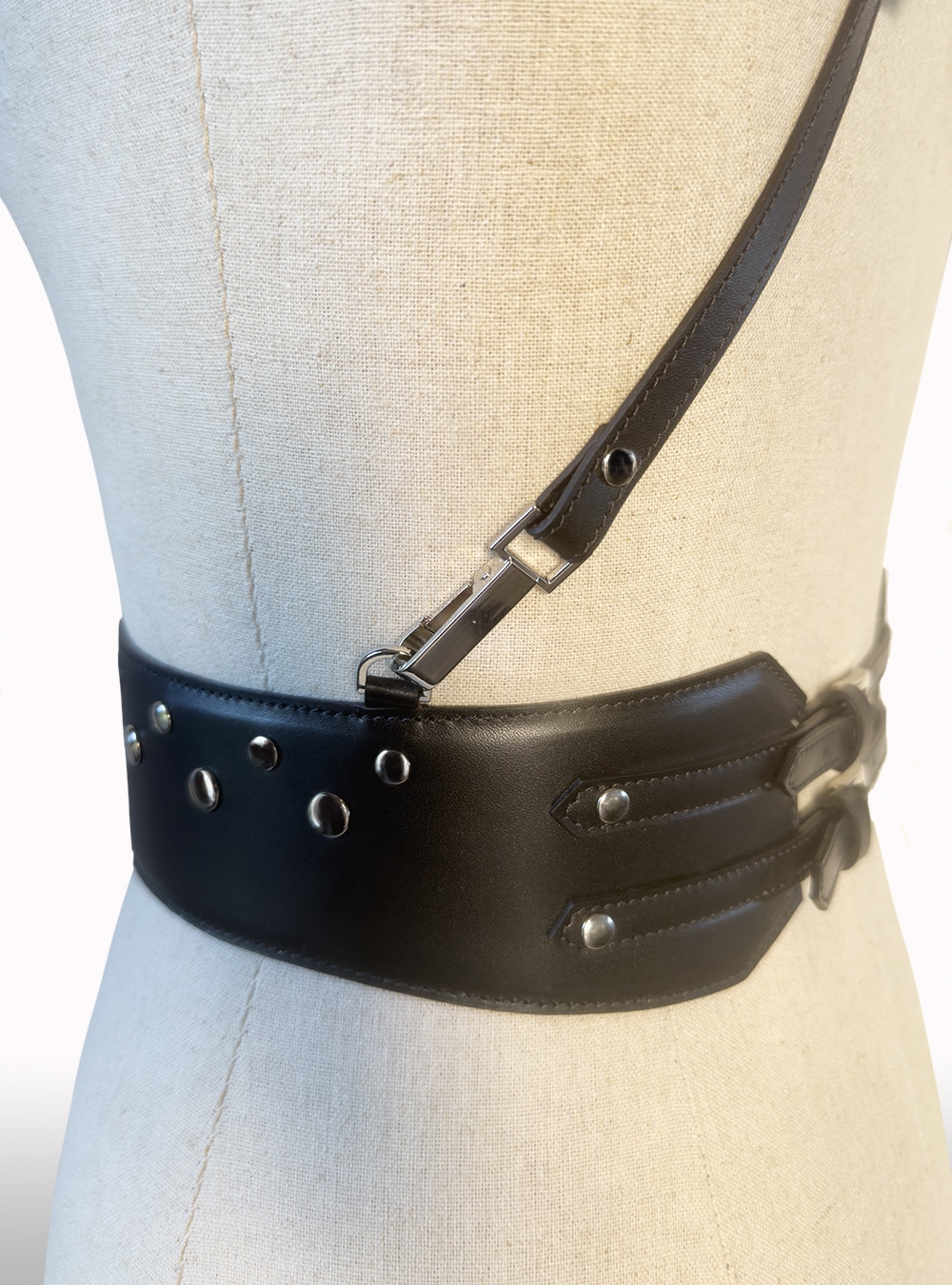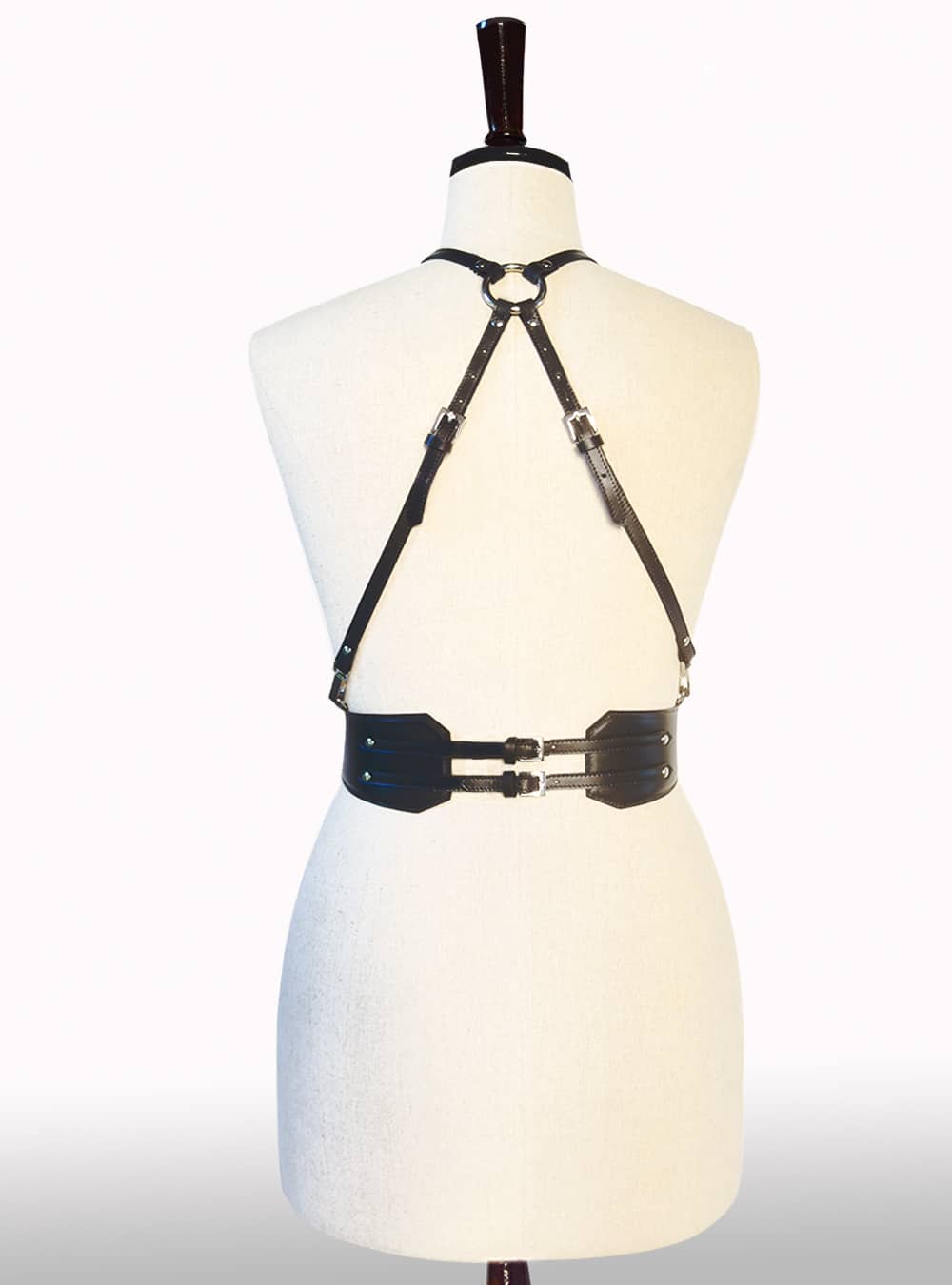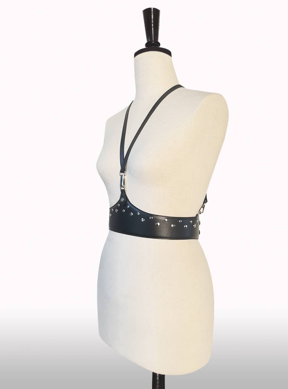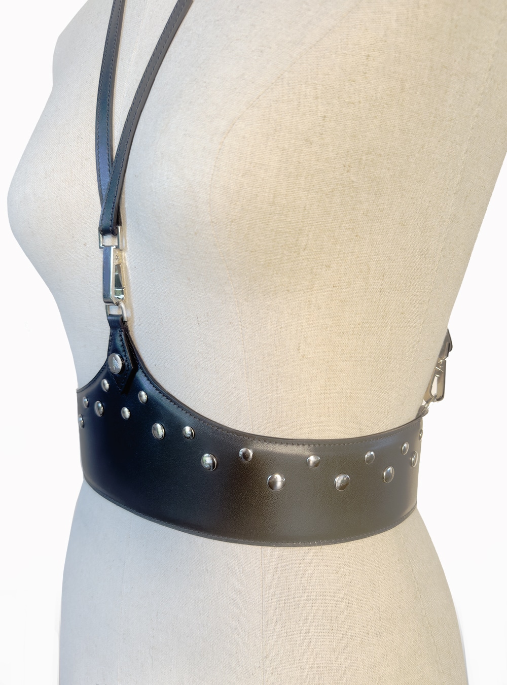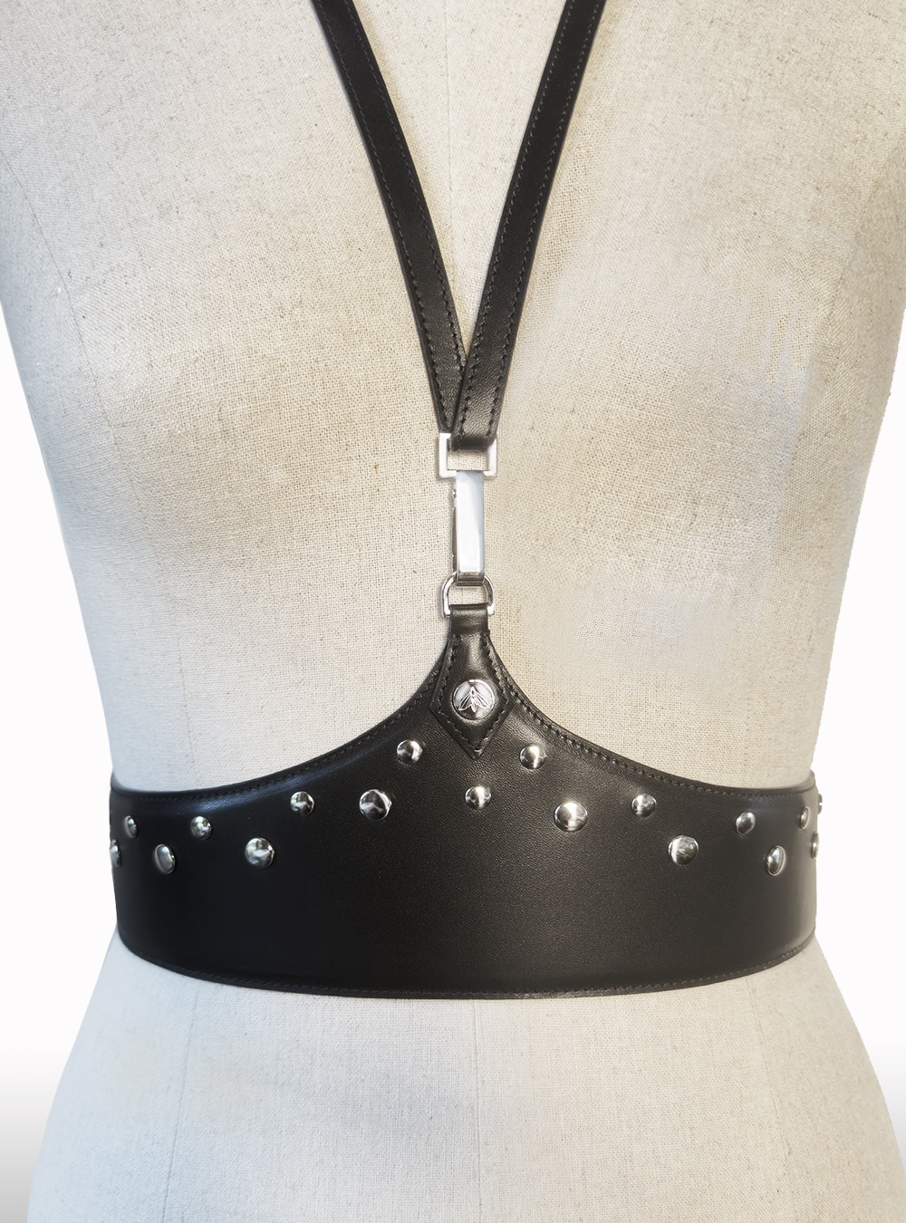 Harnais en cuir de veau noir mat, entièrement doublé pour un confort optimal.