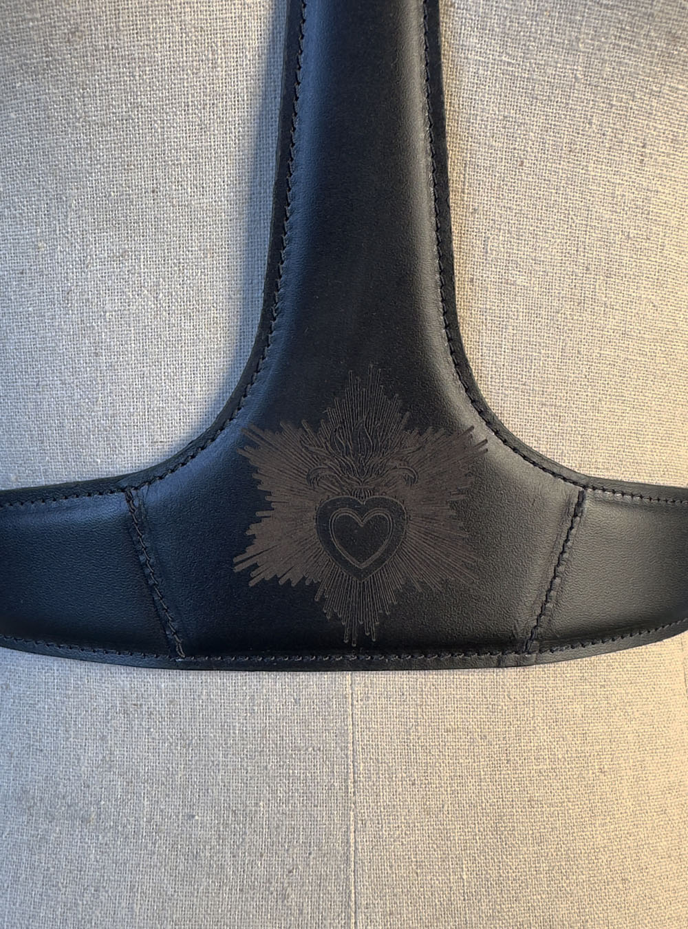 Sur le devant, le harnais est gravé du Cœur Sacré, symbole de vie, inspiré de l’univers du tatouage. Signature couture, sensuelle et graphique.
