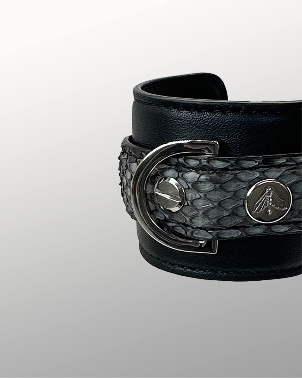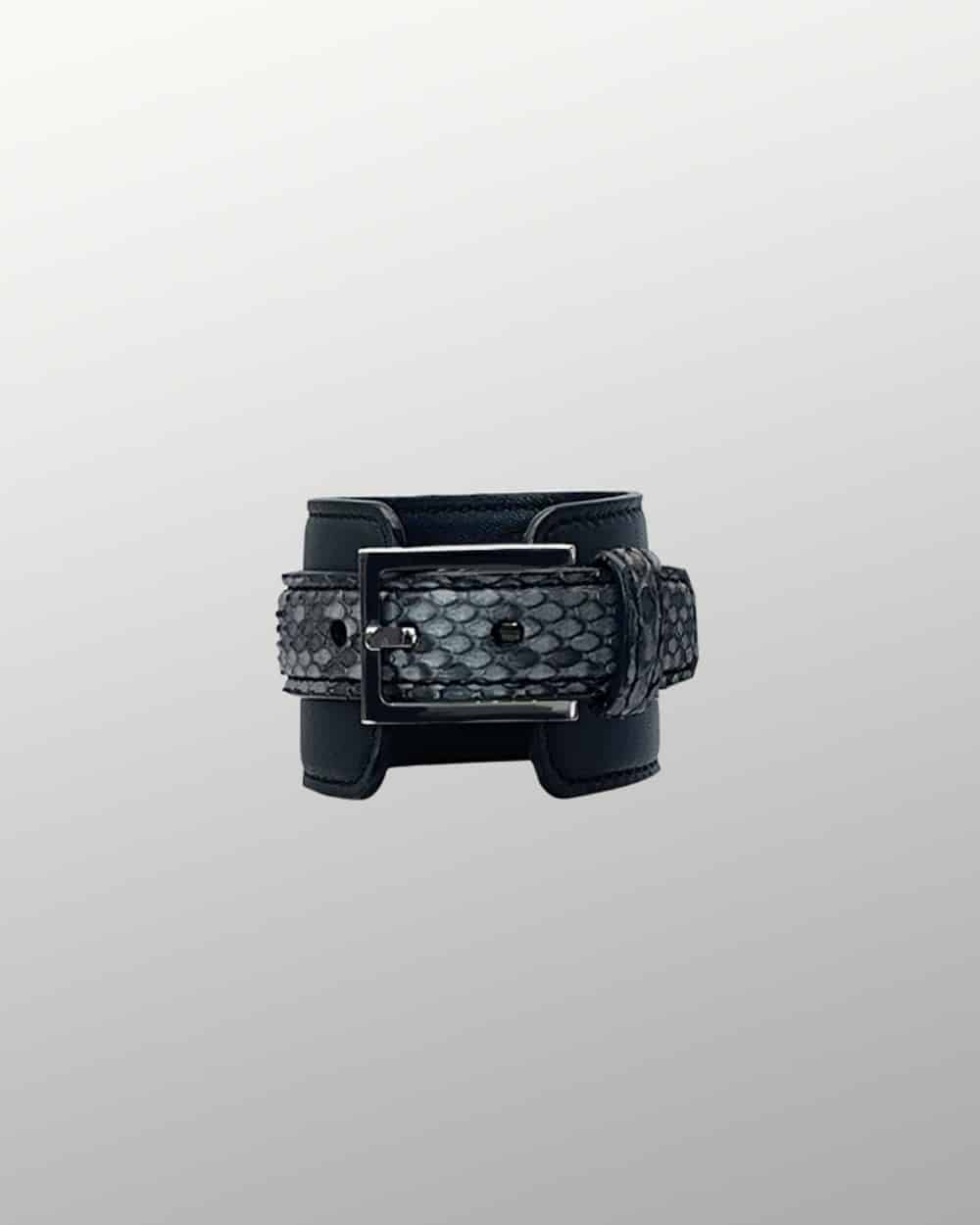 La manchette ARWYN se compose de deux bracelets en cuir superposés :vun premier bracelet large en cuir noir sur lequel vient se poser un second bracelet en python véritable gris, plus fin, comme une ligne posée avec précision.